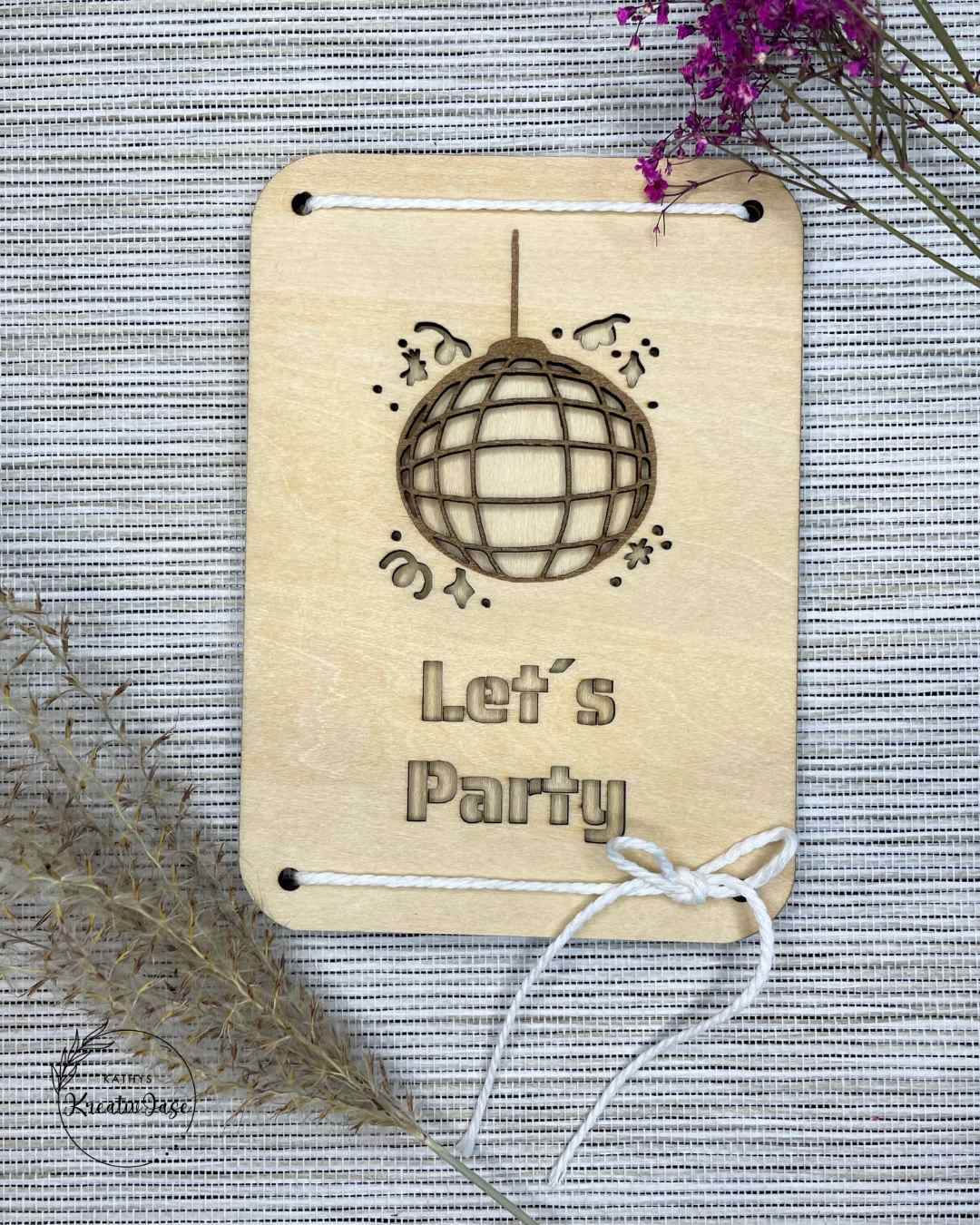 Holz-Grußkarte „Let´s Party“ mit Durchblick