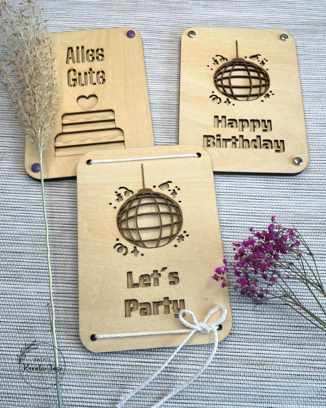 🌿 Holz-Grußkarte „Let´s Party“ mit Durchblick – kreativ Geld & Gutscheine verschenken
